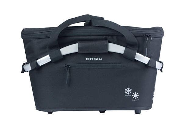 De Classic Carry All Iso Rear Basket van Basil is een trendy, lichtgewicht fietsmand en koeltas voor achterop de fiets. De afneembare stoffen mand biedt ruimte voor ca. 18 liter aan spullen en is gemaakt van sterk, waterafstotend gerecycled polyester. Deze Classic Carry All is uitgevoerd in het zwart en voorzien van een isolerende binnenvoering, reflectie en een MIK 2.0 adapterplaat.