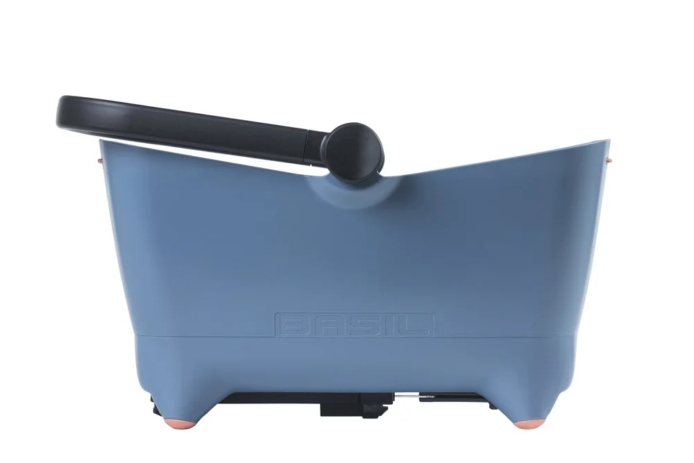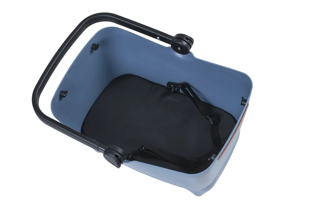 Deze hondenmand / kattenmand is bestemd voor achterop de fiets en past op bijna elke bagagedrager. De kleur is 'faded denim', ofwel een wat vale kleur blauw. De voetsteunen en het Basil 'Keep in Place' elastische koord in zacht oranjeroze steken daar speels tegen af.