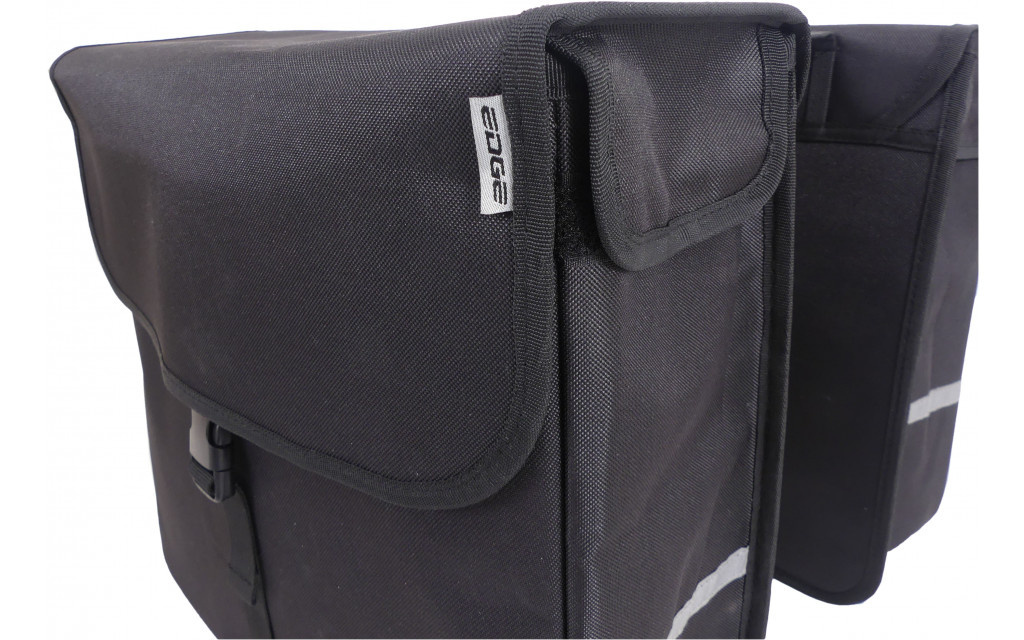 Deze zwarte dubbele Luxe Shopper van het merk Edge is gemaakt van waterafstotend polyester en biedt ruimte voor 40 liter aan spullen. De tas is voorzien van reflectie en regenoren, en is gemakkelijk aan de bagagedrager te bevestigen met riempjes. Een praktische, stevige en betaalbare dubbele fietstas!